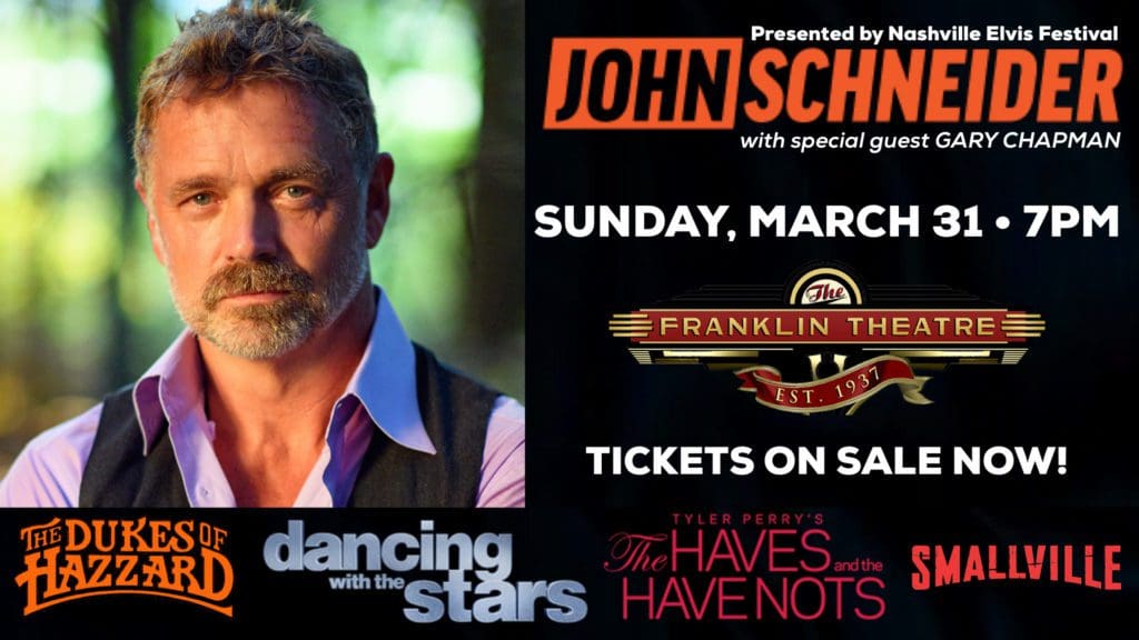 John Schneider is best known for the iconic role of “Bo Duke” on The Dukes of Hazzard, as well as CW’s Smallville and his current series, Tyler Perry’s The Haves and the Have Nots on OWN. He also recently danced his way into America’s heart on Dancing with the Stars! In addition to his extensive acting career, John is a celebrated country music artist with 4 #1 singles and 10 albums to his credits. His very first hit was 1981’s cover of Elvis Presley’s “It’s Now Or Never,” which reached #4 on the Billboard Country chart. It remains the top charting Elvis cover of all time in any genre to date. This is a separately ticketed event and is not an official part of the Nashville Elvis Festival.
